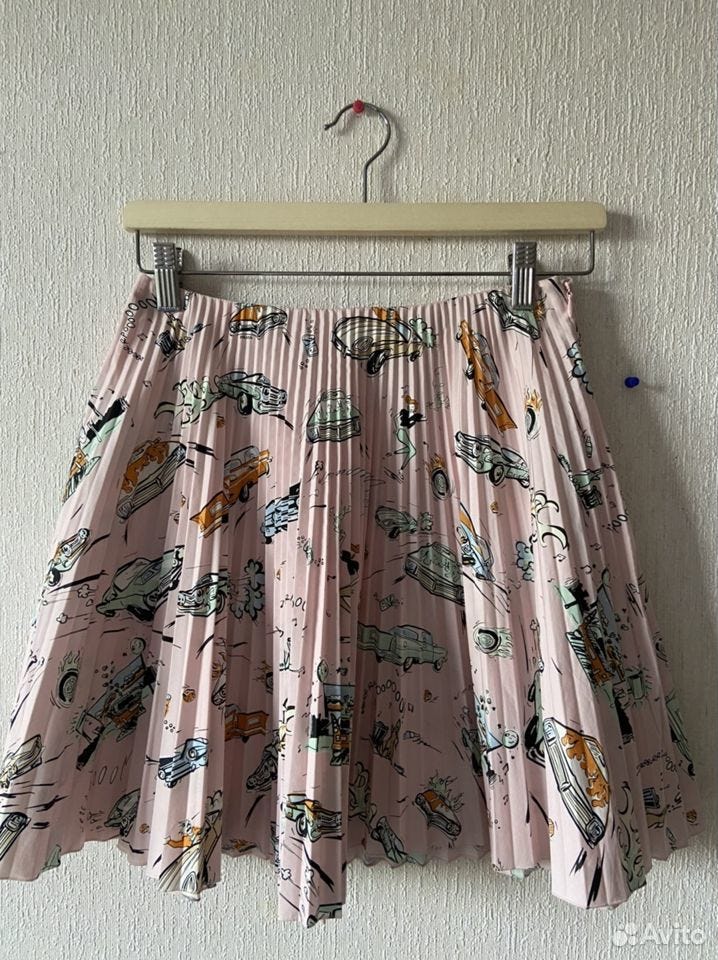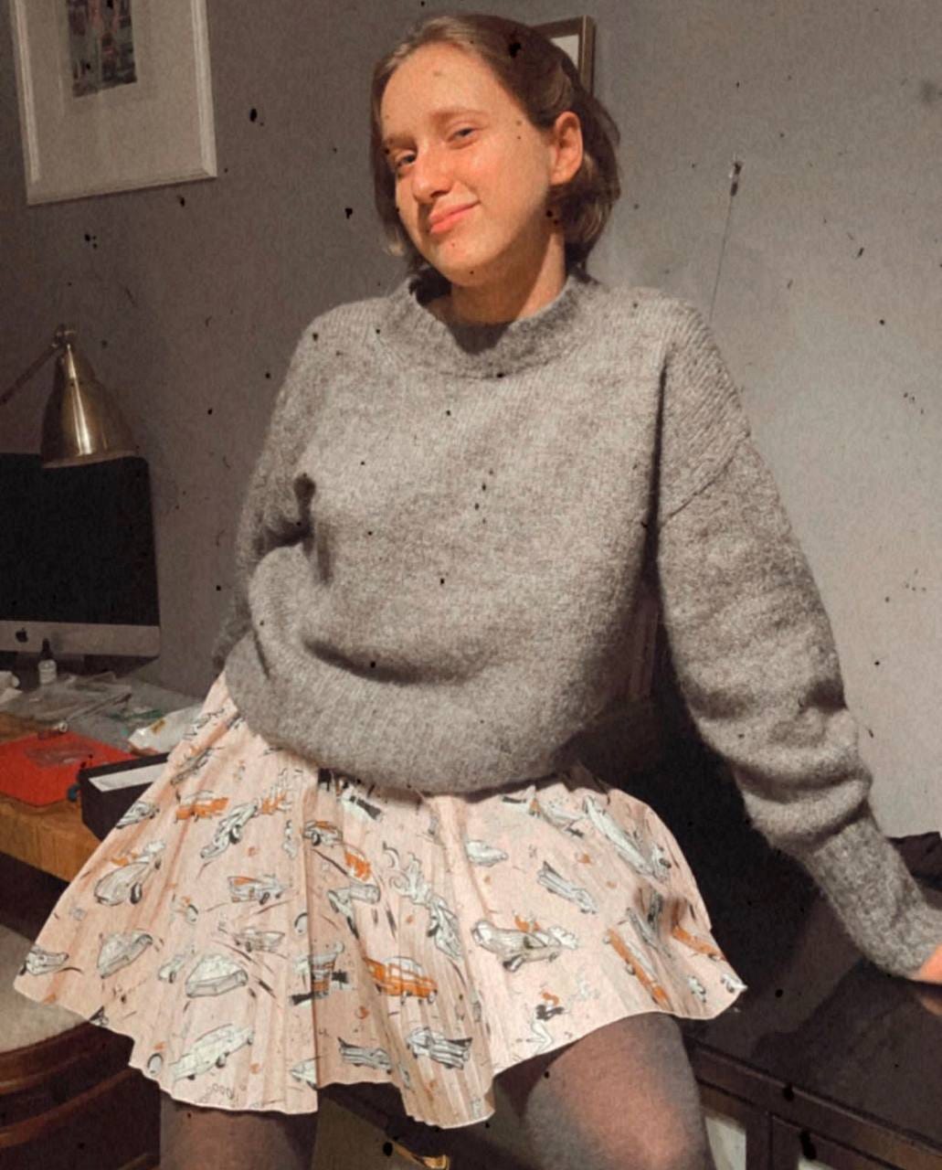 Точно такая же юбка есть у моей младшенькой. Этот принт с машинками — один из самых известных у Prada. Мне очень нравится, как розовая мини смотрится с серыми колготками и свитером — лук для инспира от Лили вы найдете ниже.